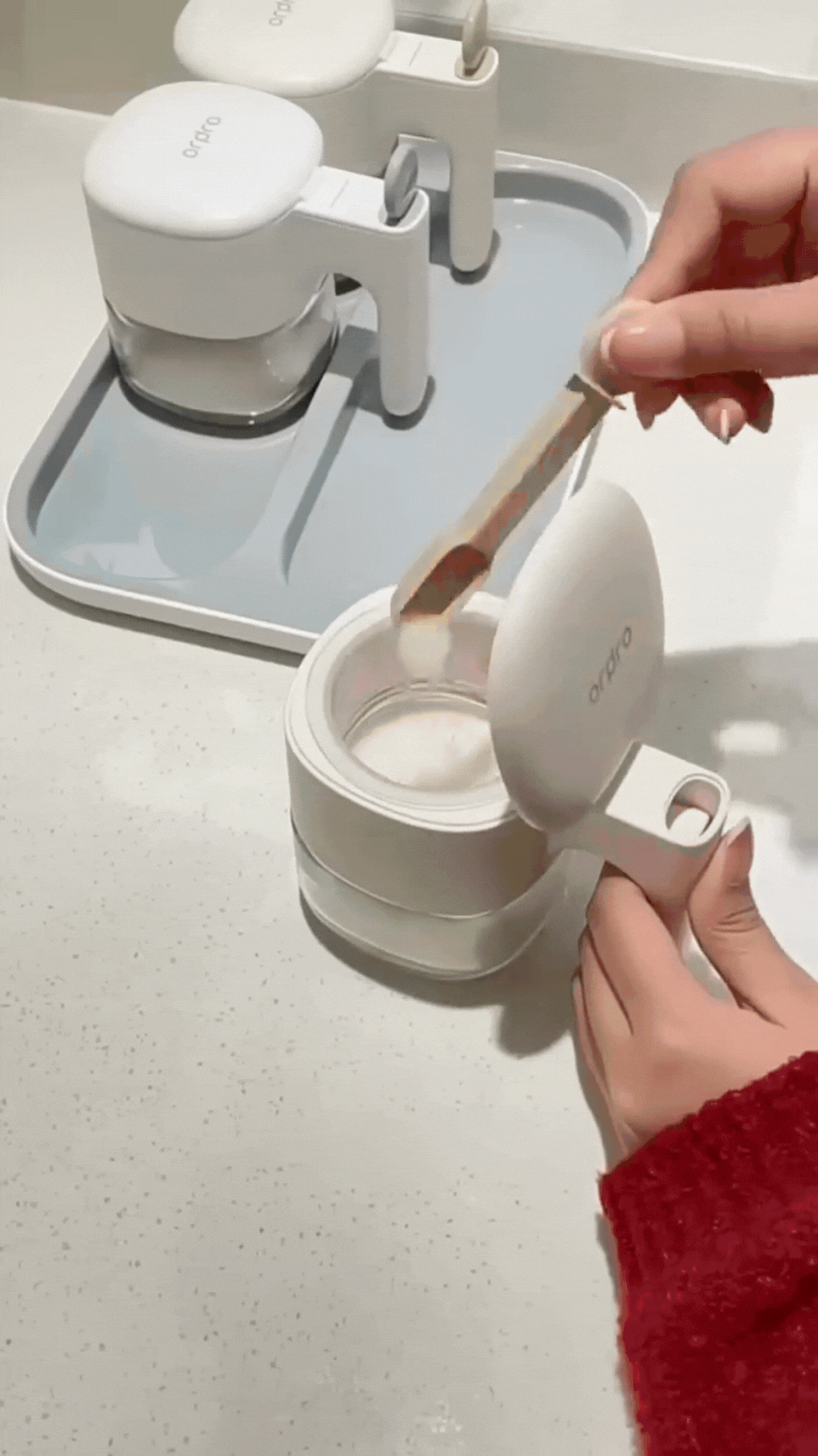 العبوة الزجاجية يمكن غسلها في غسالة الصحون، لكن يُفضَّل غسل الغطاء يدويًا لتجنّب تلف الآلية الخاصة بالفتح والإغلاق