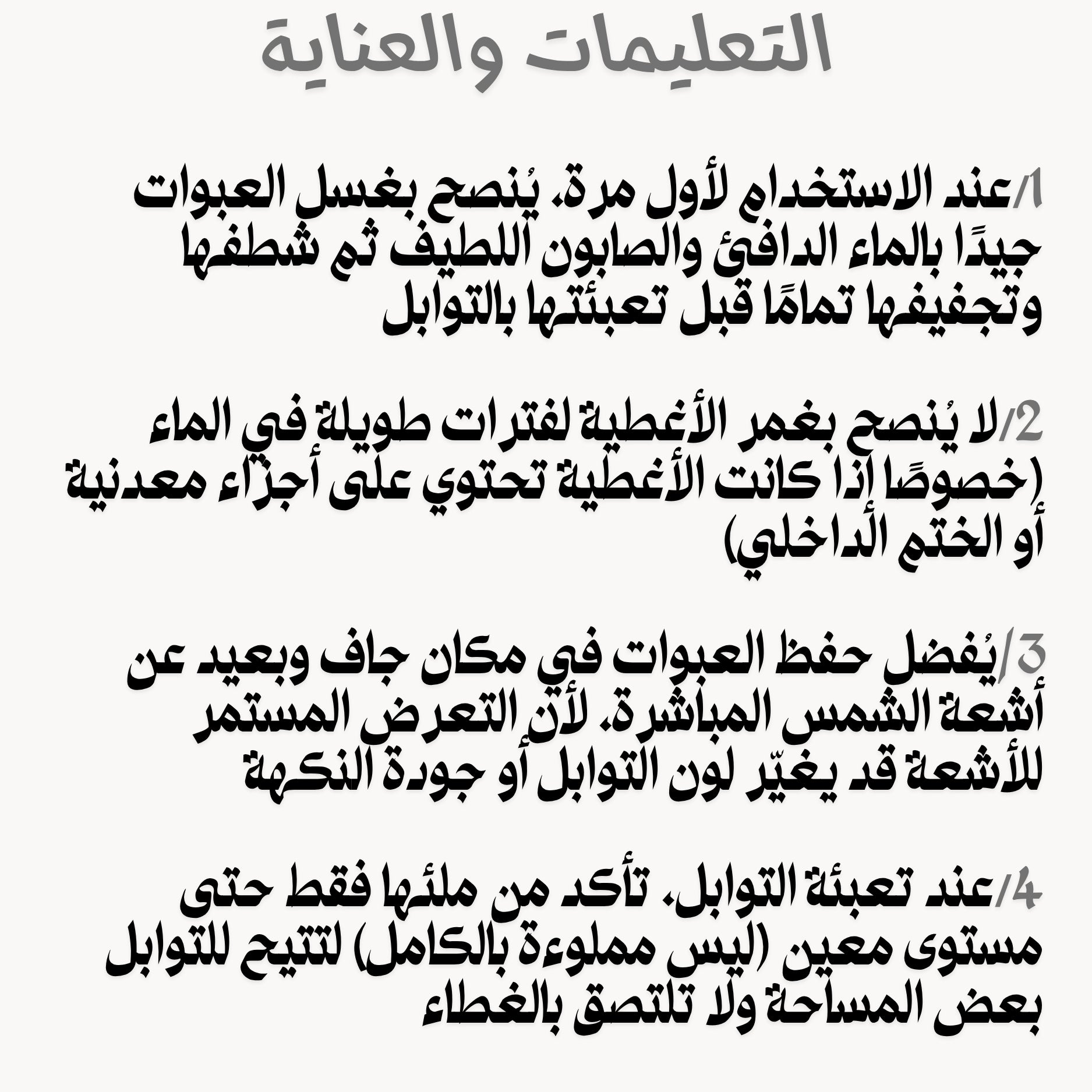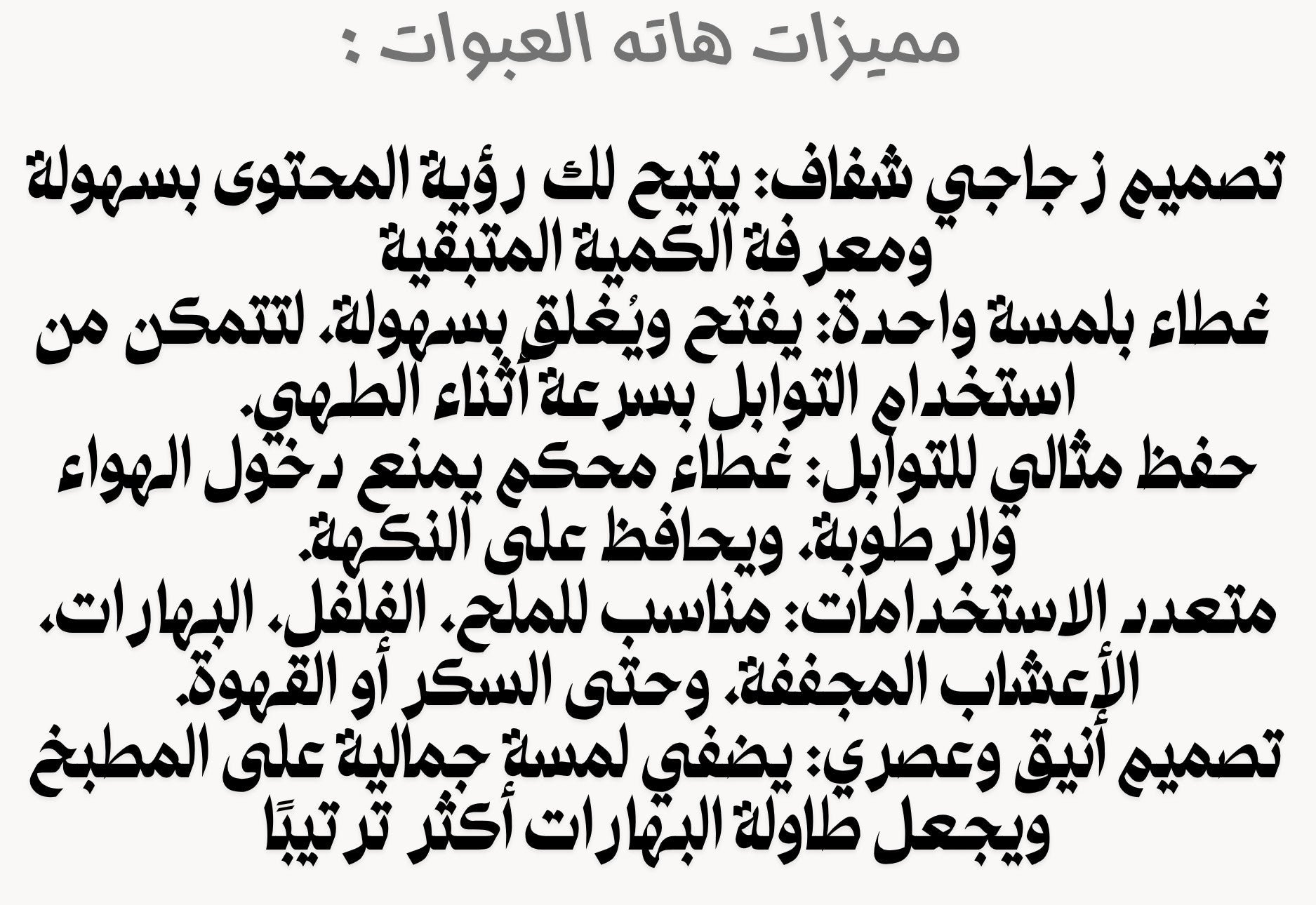 يفضّل استخدام العبوات للمواد الجافة فقط مثل البهارات، الملح، السكر، أو الأعشاب المجففة. فهي ليست مخصصة للسوائل